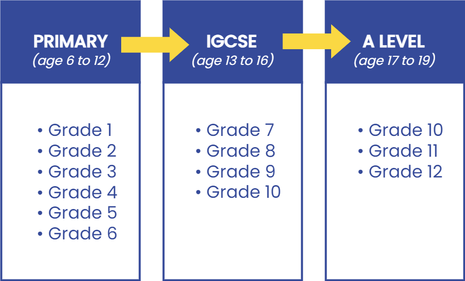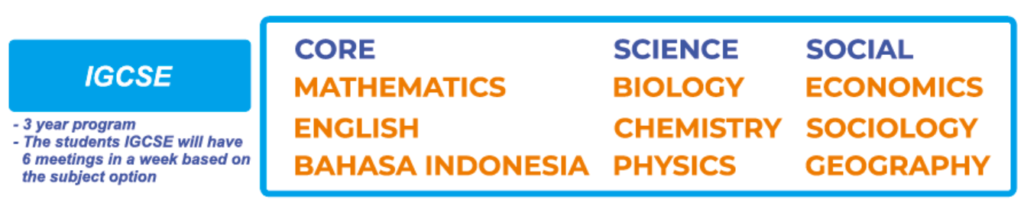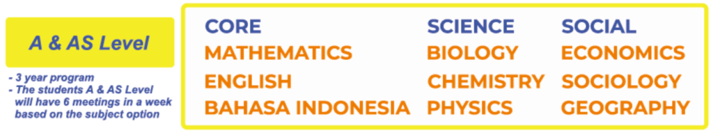 Program pendidikan internasional mengimplementasikan Cambridge Assessment International Education (CAIE) atau Cambridge Curriculum. Program ini terdiri dari program primary, International General Certificate Secondary Education ( IGCSE ), dan General Certificate Education Advance Subsidiary and Advanced Level (GCE AS & A Level). Keluaran/ output dari program pendidikan internasional adalah Cambridge Certificate. Program belajar pada Cambridge Primary, Secondary dan Advance Level ditempuh dengan menggunakan batas usia yang ditampilkan sebagai berikut.